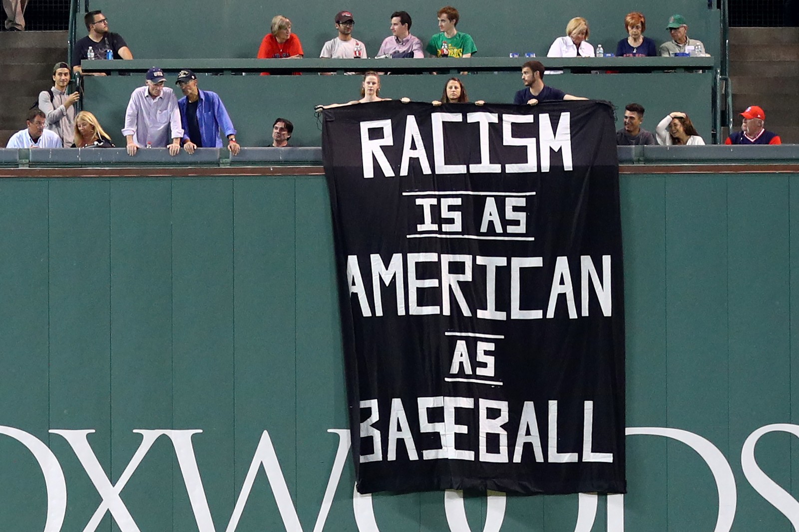 Quatro pessoas foram removidas da partida entre Boston Red Sox e Oakland Athletics por desfraldarem uma bandeira de protesto com os dizeres: "O racismo é tão americano quanto o baseball". A bandeira foi aberta no "Monstro Verde", famoso muro do setor esquerdo do estádio do Red Sox. Em campo, os Athletics venceram o Red Sox por 7 a 3.